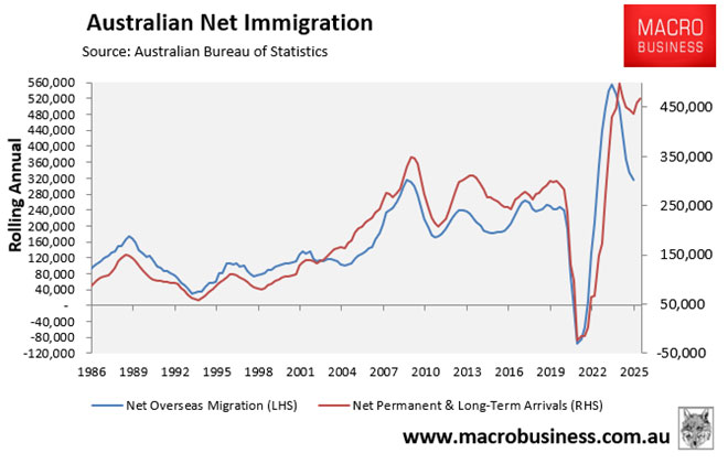Meanwhile, the latest data on net permanent and long-term (NPLT) arrivals from the ABS hit a record high over the first eight months of 2025, suggesting that net overseas migration has reaccelerated from already historically high levels: