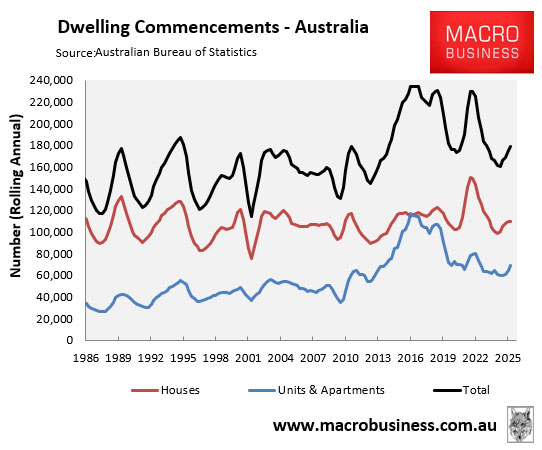 However, over the year to the June quarter of 2025, total dwelling commencements lifted by 9.2% to 179,038, driven by a 27.7% increase in units and apartments:
