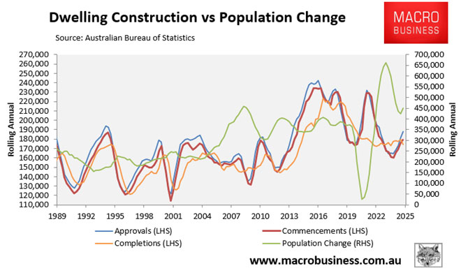 The following chart plots annual dwelling approvals, commencements, and completions against the nation’s population growth to the June quarter of 2025: