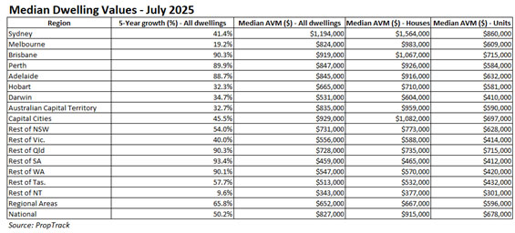 Melbourne’s median dwelling value in July 2025 was $824,000, 11.3% below the combined capital city median value of $929,000 and the cheapest of the five major capital city markets.